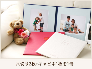 六切り2枚を1冊に仕上げ、平岡写真館からお誕生日のプレゼントにキャビネ写真をイーゼルフレームに入れてお渡しします。